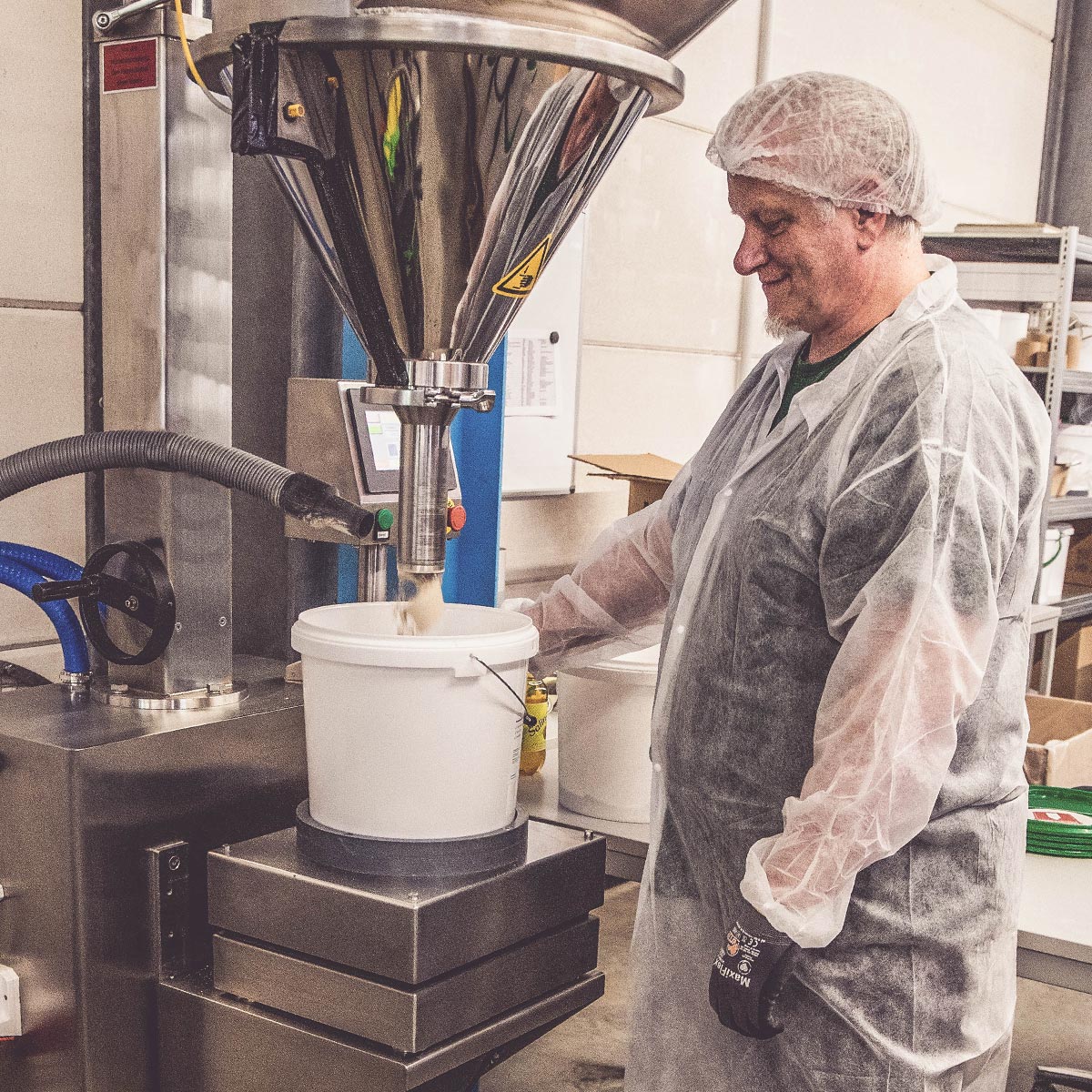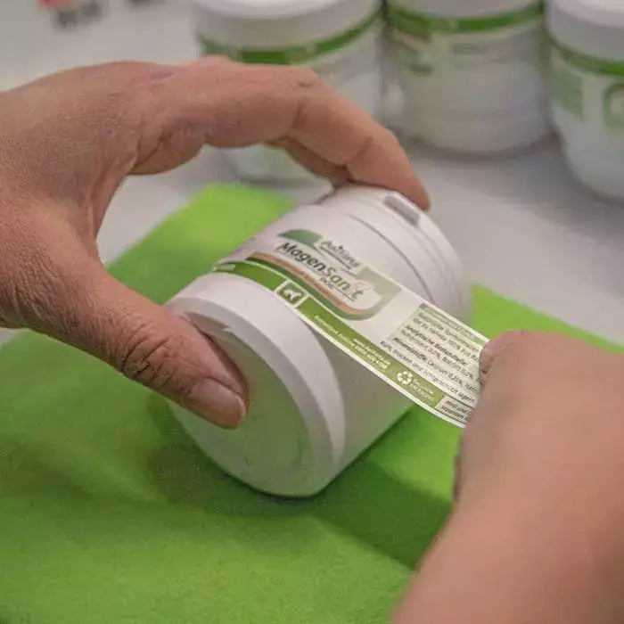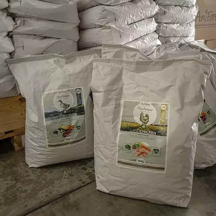 Auf den Etiketten der Rohstoffsäcke stehen Namen wie Brombeerblätter, Gerstengras oder Löwenzahnwurzel. Das sind nur drei der rund 200 Rohstoffe, die bei uns in der Produktion verarbeitet werden. Über 400 Produkte – vom Futter über Pflege bis hin zu Ergänzungsfuttermitteln für Hund, Katze, Pferd & Co. - zählen zu unserem Sortiment. Fast alle Produkte werden in unserer hauseigenen Produktion entwickelt und hergestellt.