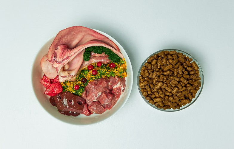 Dry food and BARF differ significantly in their composition. Conventional dry food often contains high levels of gluten, preservatives, and synthetic additives. A BARF bowl, on the other hand, consists of raw meat, bones, offal, vegetables, and fruit—foods that are closer to a dog's natural diet.